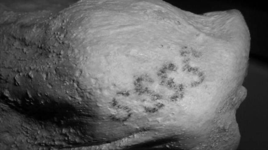 La momia de la mujer presenta un tatuaje más enigmático. Se trata de